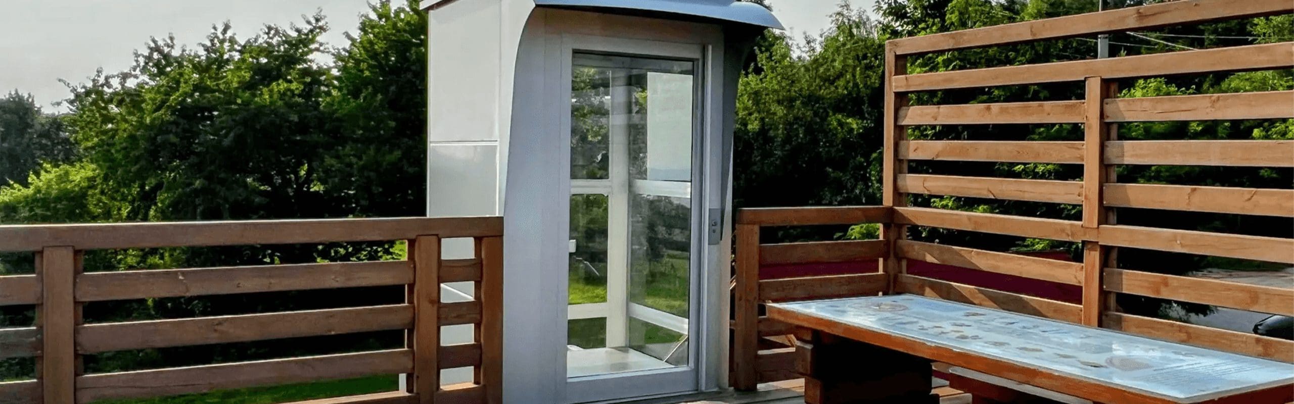 لضمان مقاومة مصاعدنا للعوامل الجوية، تتضمن تجهيزاتنا الخارجية الموحدة: معالجة مقاومة للتآكل للإطار السفلي والمنصة، قسم كهربائي محمي من الفيضانات، أبواب من الألمنيوم وأزرار تحكم مقاومة للطقس، بالإضافة إلى أسقف ومظلات للأبواب مصممة خصيصًا للاستخدام الخارجي.
