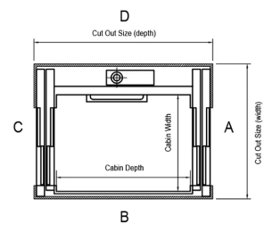 The cut out size refers to the minimal space required to install the lift. For cabin lifts designed to be placed in a masonry shaft, the cut out size indicates the minimal dimensions of the lift pit (width x depth) and the minimal internal dimensions of the masonry shaft (width x depth, mm). For cabin lifts designed to be installed with a ready-made shaft, the cut out size indicates the minimal dimensions of the lift pit (width x depth) and the minimal dimensions of the opening between floors (width x depth, mm).